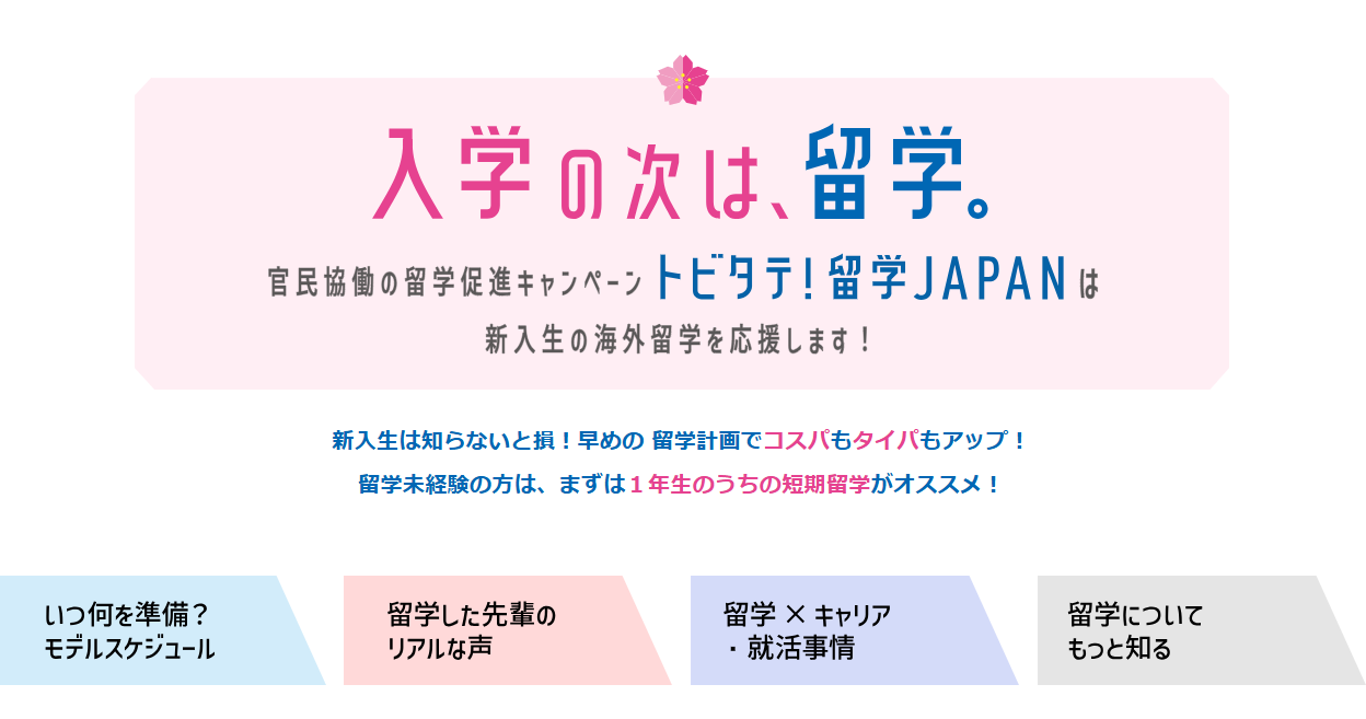 トビタテでは、この春大学に入学し、入学の次はぜひ留学にチャレンジしてみたい方のために、留学に役立つ情報を盛り込んだページを制作しました。ぜひ、ご覧ください!